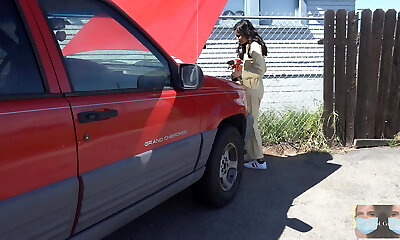 Brunette chick in trouble spreads her legs for a rod on a hood of a car