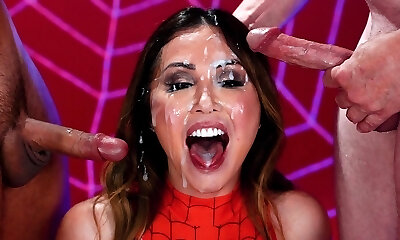 Big breasted brunette in big jizz-shotgun bukkake